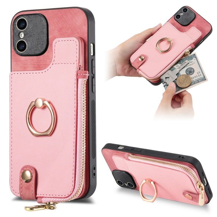 Funda Trasera para iPhone X Xs con Billetera, Cremallera Vertical y Anillo de Cuero Cruzado (Rosa)