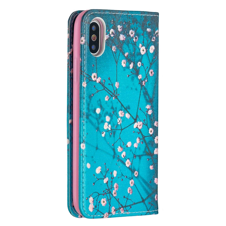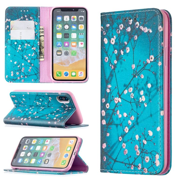 Estuche de Cuero de Pu para iPhone X Xs con Tapa Horizontal Magnética Soporte Ranuras y Billetera (Flor del Ciruelo)