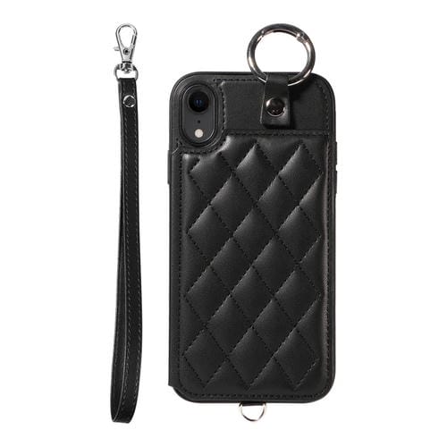 Estuche para Teléfono iPhone Xr con Bolsa para Tarjetas Textura Rómbica y Cordón Corto (Negro)