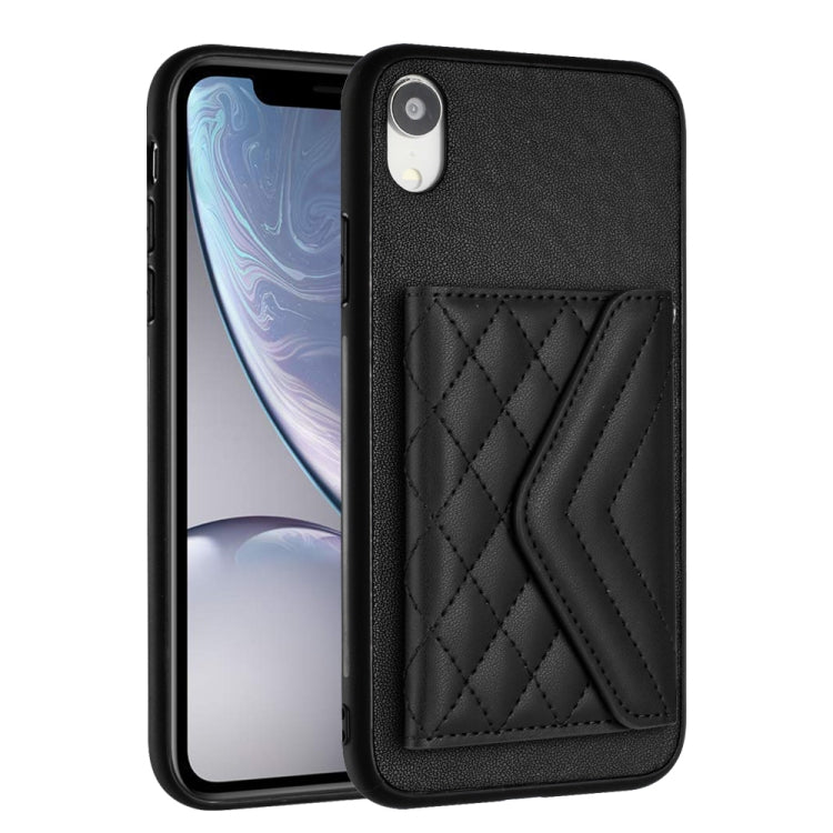 Estuche para Teléfono iPhone Xr con Bolsa para Tarjetas Rfid Textura Rómbica y Cordón Largo (Negro)