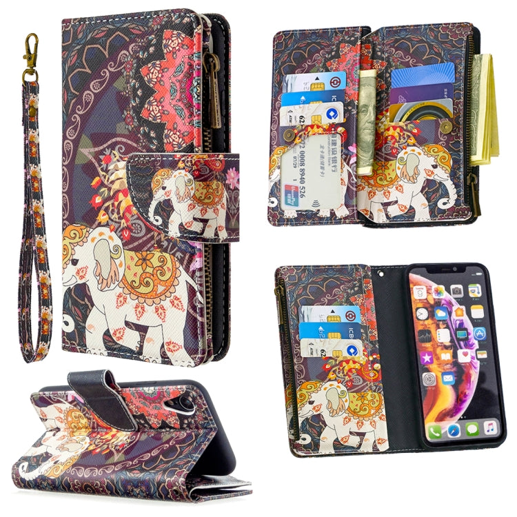 Funda de Cuero para iPhone Xr con Cremallera, Tapa Horizontal, Soporte y Ranuras para Tarjetas (Elefantes de Flores)