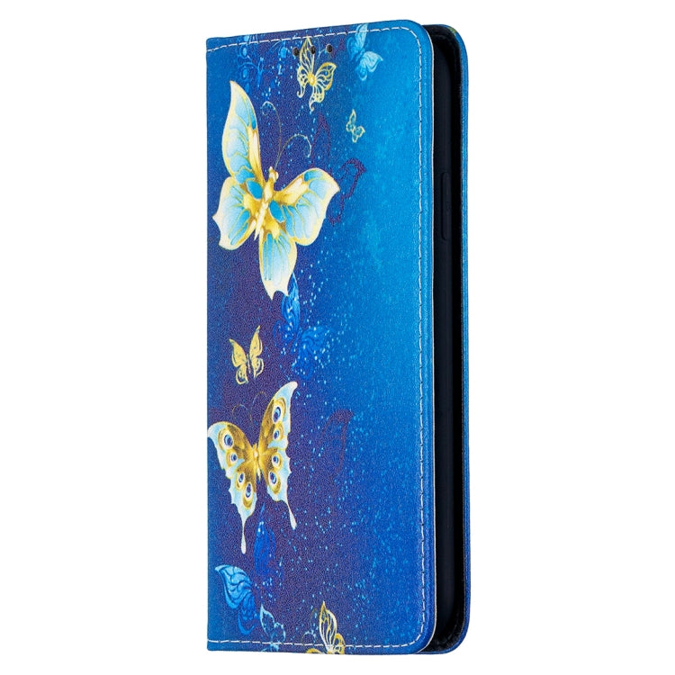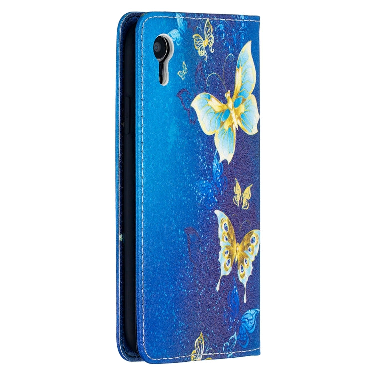 Estuche de Cuero de Pu para iPhone Xr con Patrón de Dibujo a Color, Tapa Horizontal Magnética Invisible, Soporte y Ranuras para Tarjetas (Mariposas Doradas)