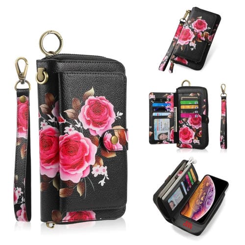 Funda de Cuero Pola Flower para iPhone Xr con Billetera y Cremallera Multifuncional (Negro)