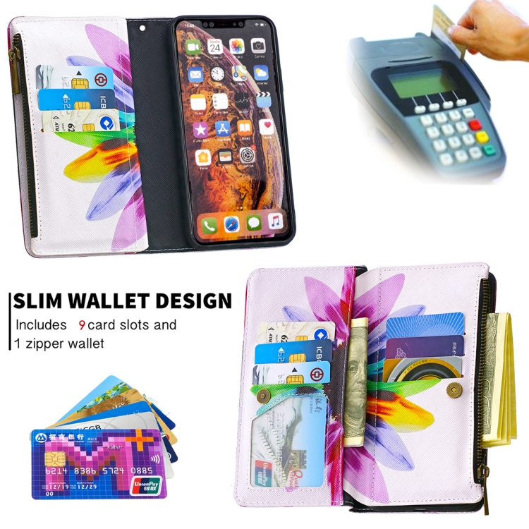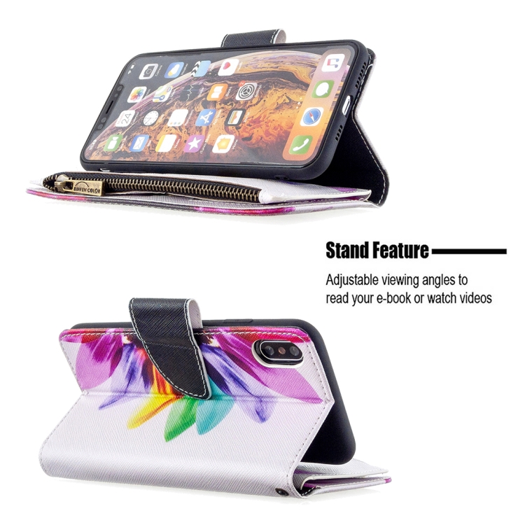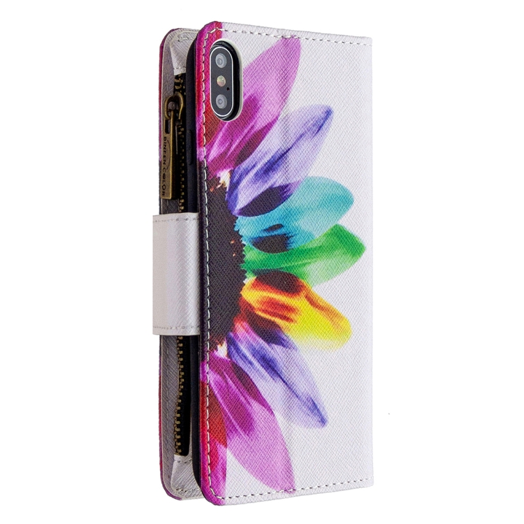 Funda de Cuero para iPhone Xs Max con Patrón de Dibujo, Cremallera, Tapa Horizontal, Soporte y Ranuras para Tarjetas (Flor del Sol)