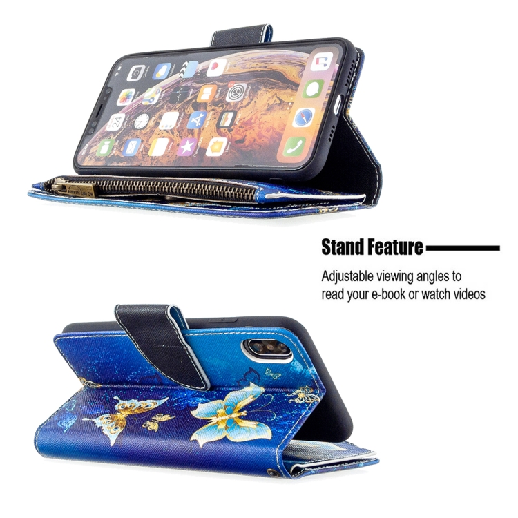 Funda de Cuero para iPhone Xs Max Patrón Dibujo Cremallera Tapa Horizontal Soporte Ranuras Tarjetas Billetera (Mariposa Dorada)