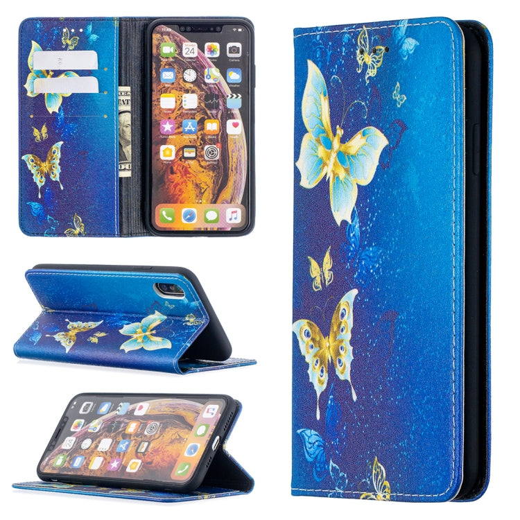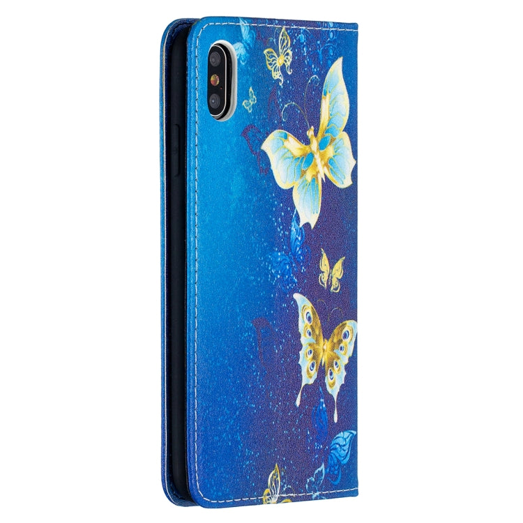 Estuche de Cuero PU para iPhone Xs Max Patrón Dibujo con Tapa Magnética Soporte Ranuras y Billetera (Mariposas Doradas)