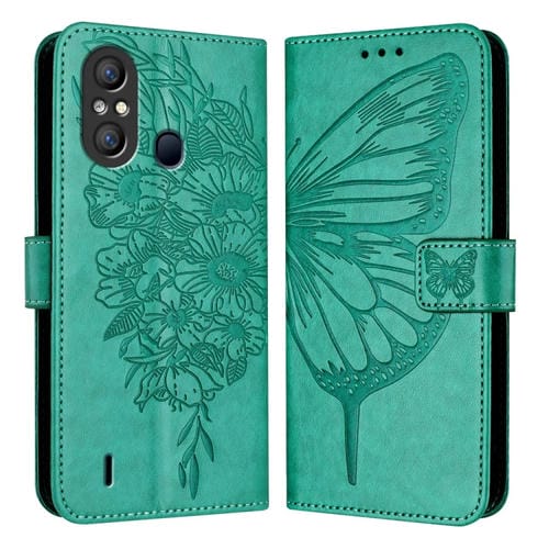 Funda de Cuero para Itel A58 / A49 con Mariposa en Relieve (Verde)