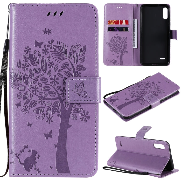 Funda Cuero PU LG K22 K22 Plus con Patrón Árbol y Gato, Tapa Horizontal, Soporte, Ranuras y Cordón (Morado Claro)