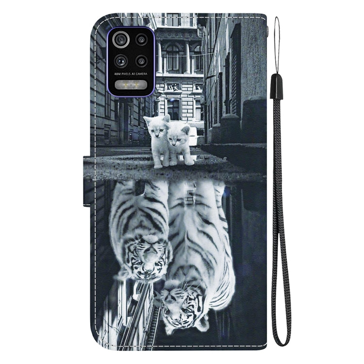 Funda para LG K52 / K62 / Q52 de Cuero con Dibujo Coloreado y Textura de Cristal (Reflejo de Tigre Gato)