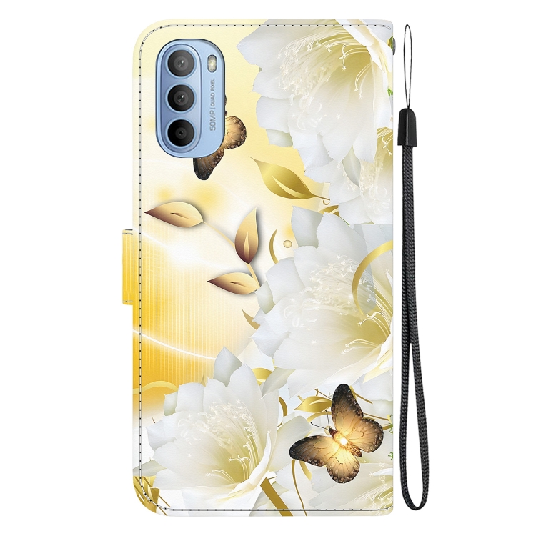 Estuche de Cuero para Motorola Moto G31 y G41 con Dibujo Epiphyllum Mariposa Dorada y Textura de Cristal