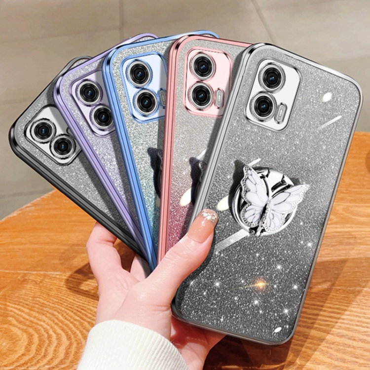 Funda TPU para Motorola Moto G73 con Soporte de Mariposa y Brillo Degradado (Plata)