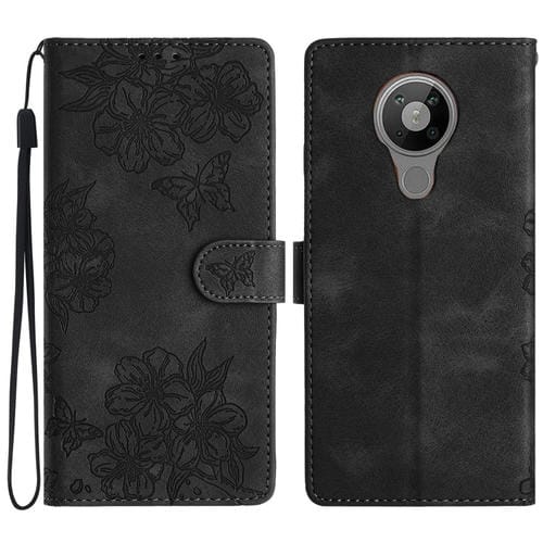 Funda para Nokia 5.4 Cherry Blossom Butterfly Skin Feel de PU en Relieve (Negro)