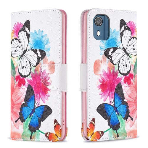 Estuche de Cuero para Nokia C02 con Patrón de Mariposas Coloreado