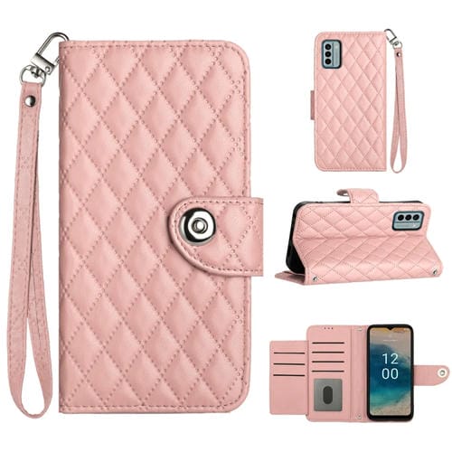 Funda de Cuero para Nokia G22 con Tapa, Textura Rómbica y Cordón (Rosa Coral)