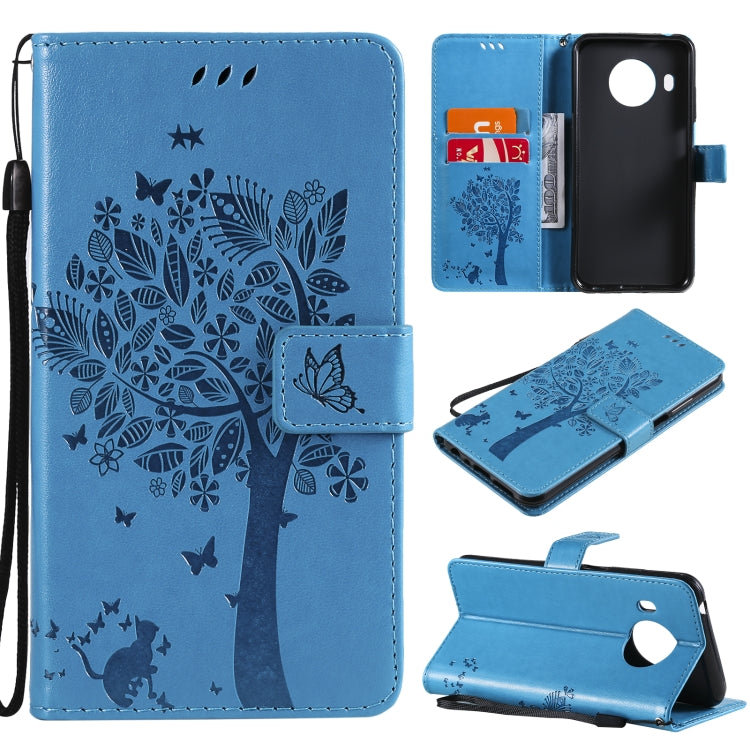 Para Nokia X10 Árbol y gato Patrón de impresión prensado Funda de cuero PU de la PU con soporte y ranuras para tarjetas y cordón (azul)