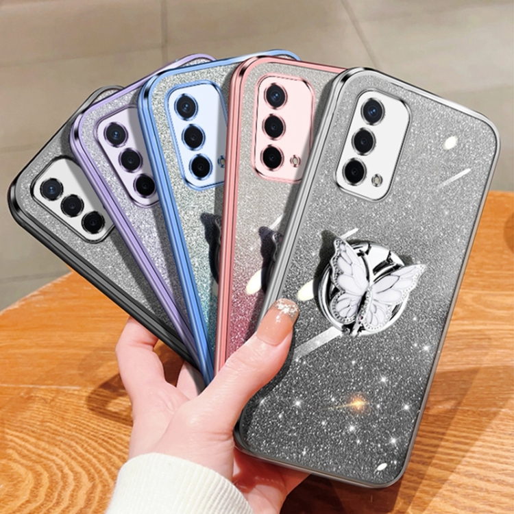 Para Oppo A93 5G Estuche para Teléfono de TPU con Soporte de Mariposa con Brillo Degradado Plateado (Negro)