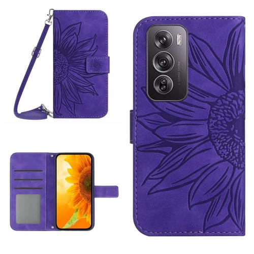 Para Oppo Reno 12 Pro 5G Global Skin Feel Funda para Teléfono de Cuero con Tapa En Relieve de Girasol y Cordón (Púrpura Oscuro)