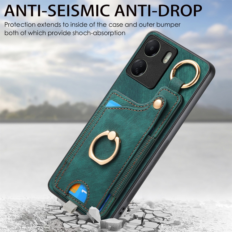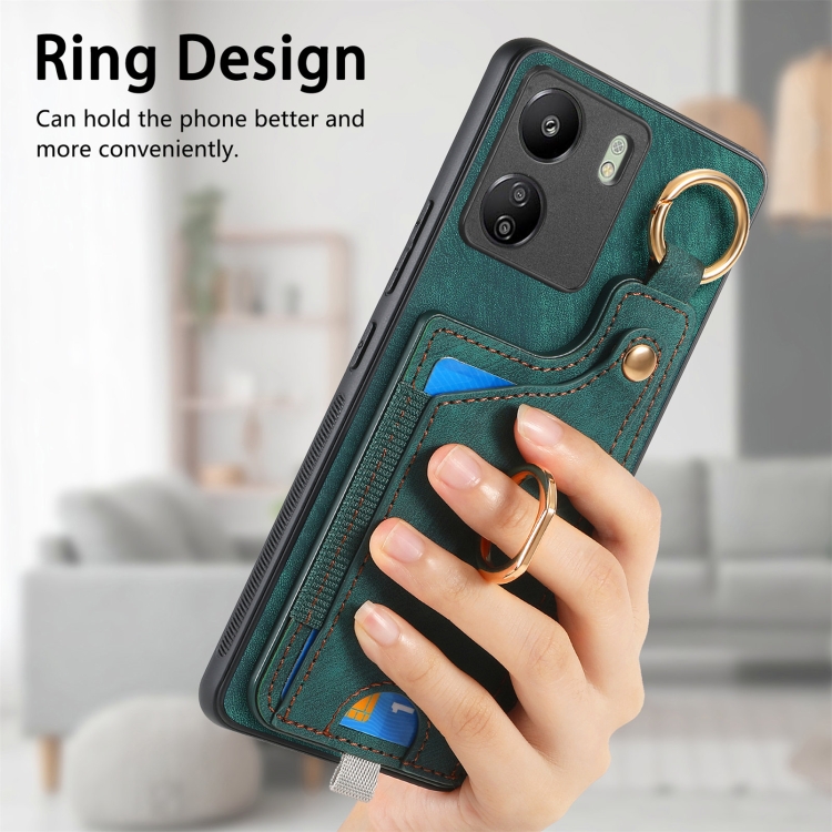 Para Redmi 12C Funda para Teléfono con Bolsa para Tarjeta con Anillo y Sensación de Piel Retro con Lazo para Colgar (Verde)