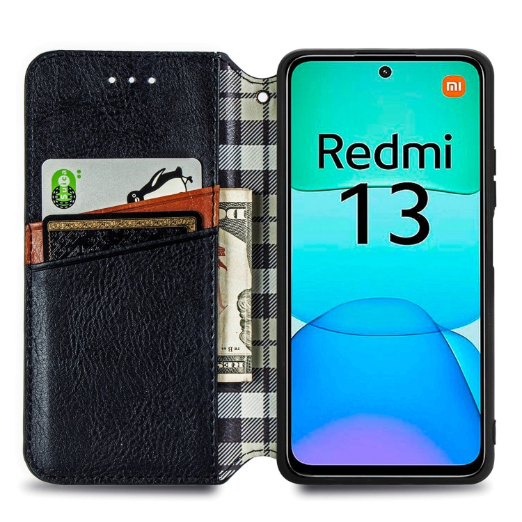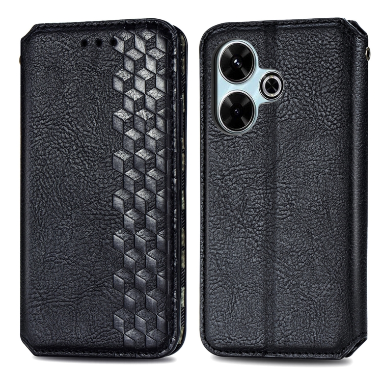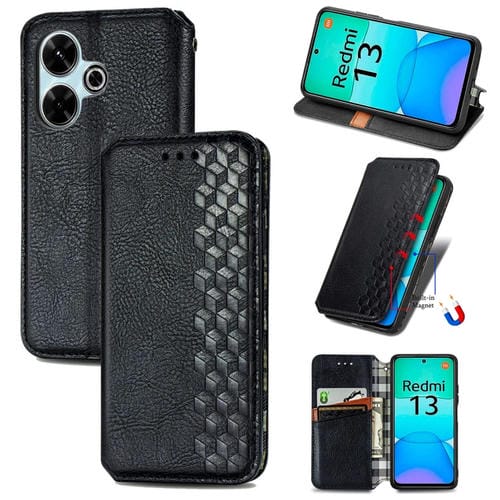 Para Redmi 13 4G Cubic Grid Funda de Teléfono de Cuero Magnético Prensado (Negro)