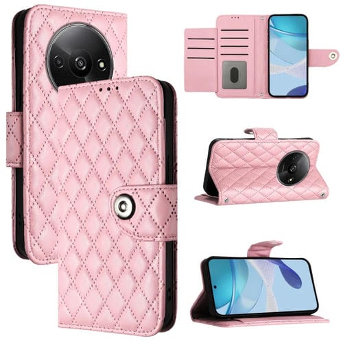 Para Redmi A3 Funda de Cuero con Tapa con Textura Rombal y Cordón (Rosa)