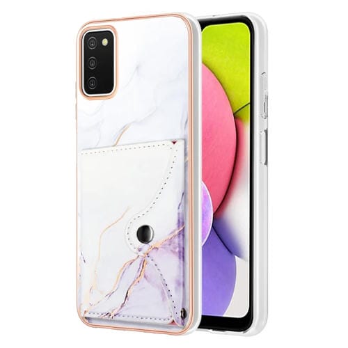 Estuche para teléfono Samsung Galaxy A03S Versión Estadounidense con ranura para tarjeta IMD patrón de mármol (Blanco y Morado)