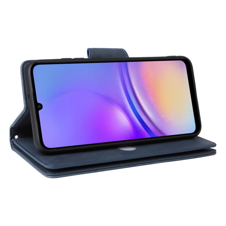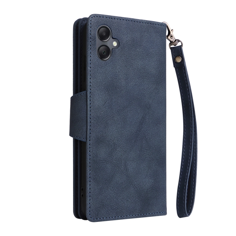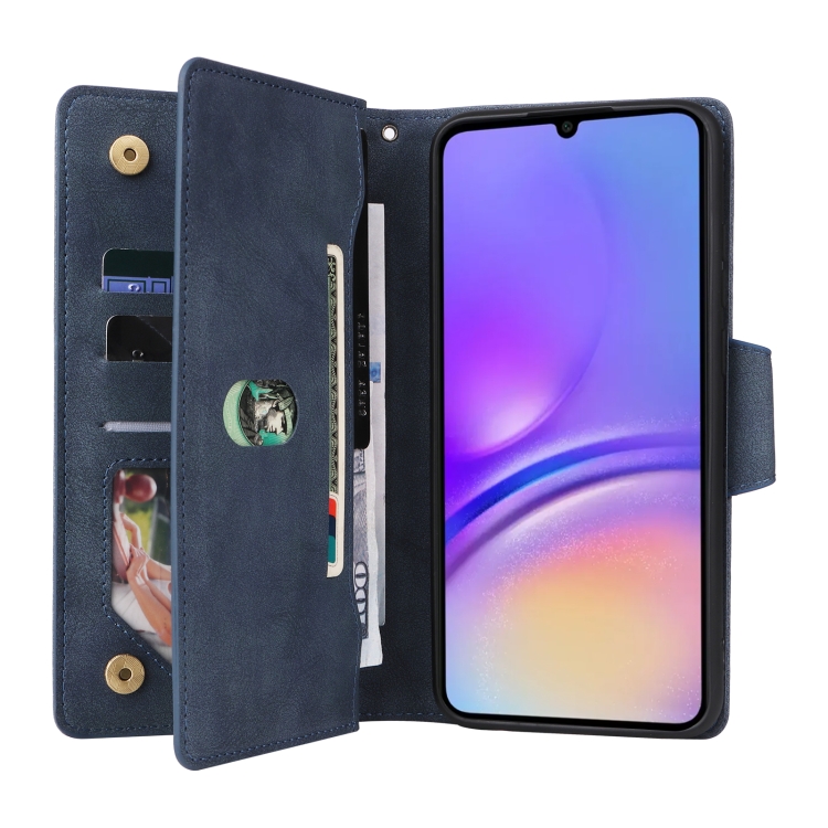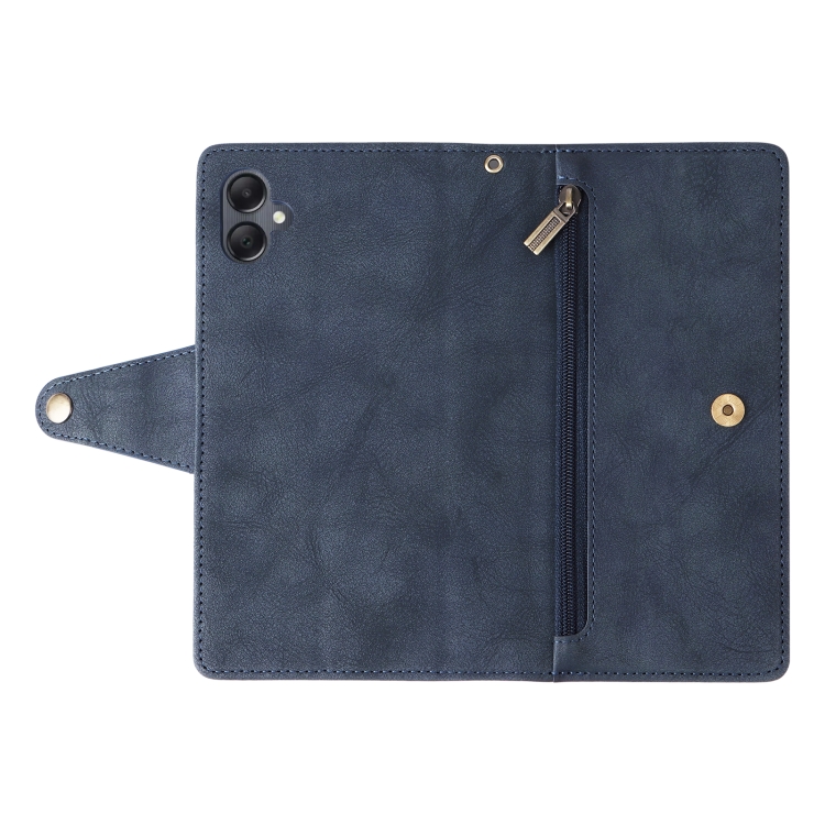Funda de Cuero para Samsung Galaxy A05 con Remache Hebilla y 9 Tarjetas con Tres Pliegues (Azul)