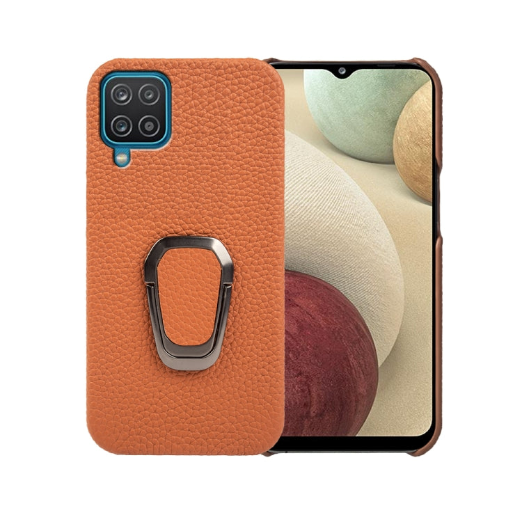 Para Samsung Galaxy A12 Ring Holder Litchi Texture Funda de teléfono de cuero genuino (marrón)