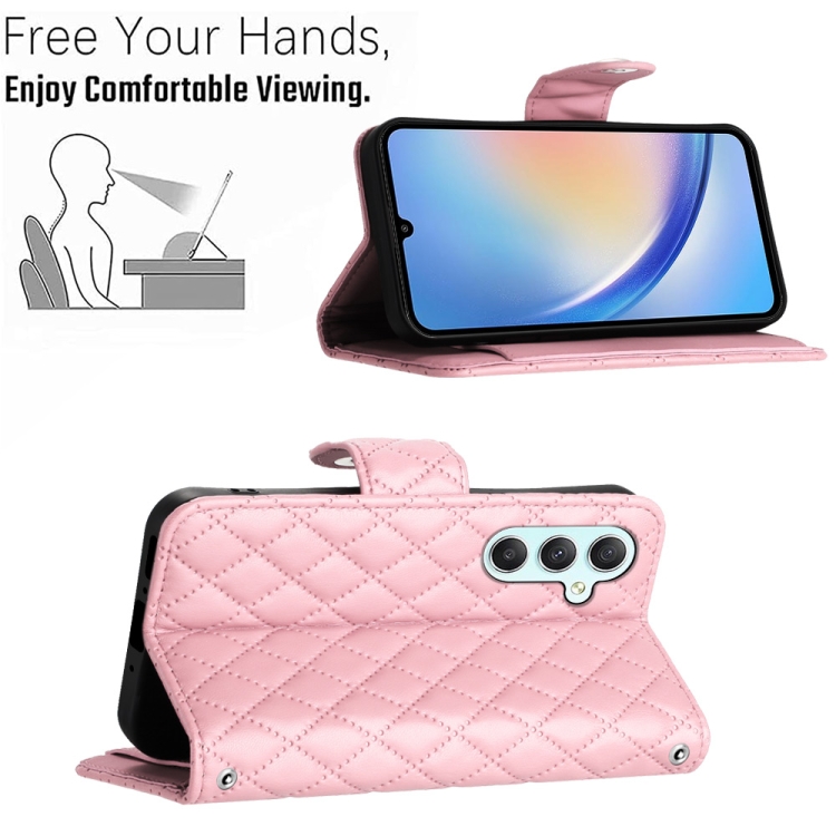 Funda de Cuero para Samsung Galaxy A24 4G con Tapa Textura Romboidal y Cordón (Rosa)