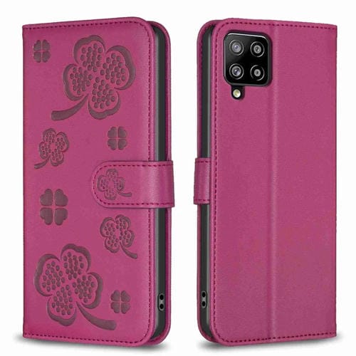 Funda de Cuero Samsung Galaxy A42 5G con Relieve de Cuatro Hojas (Rojo Rosa)