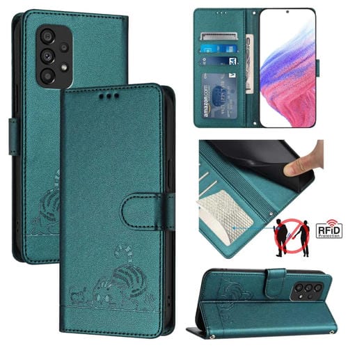 Estuche para Teléfono Samsung Galaxy A53 5G Cuero RFID Patrón en Relieve con Cordón (Verde Pavo Real)