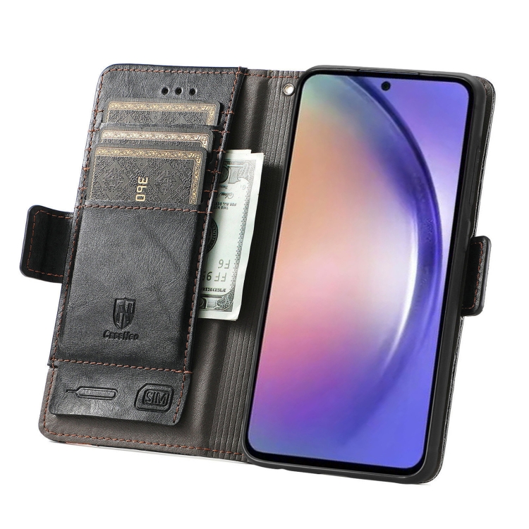 Funda de Cuero Caseneo Splicing para Samsung Galaxy A55 5G con Hebilla Magnética Dual (Negro)