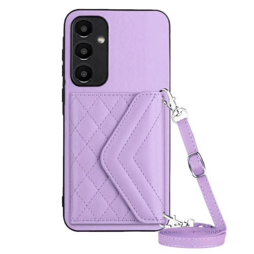 Estuche para Teléfono Samsung Galaxy A55 con Bolsa para Tarjetas Rfid Textura Rómbica y Cordón Largo (Púrpura Claro)
