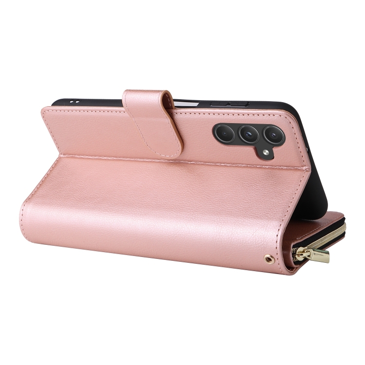 Funda para Teléfono Samsung Galaxy A55 Cuero Bolsa Billetera Cremallera Ranuras para 9 Tarjetas (Oro Rosa)