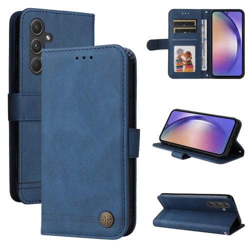 Funda de Cuero Skin Feel Life Tree para Samsung Galaxy A55 con Botón de Metal (Azul)