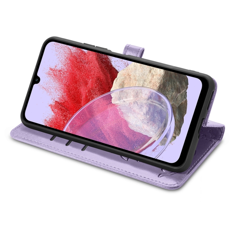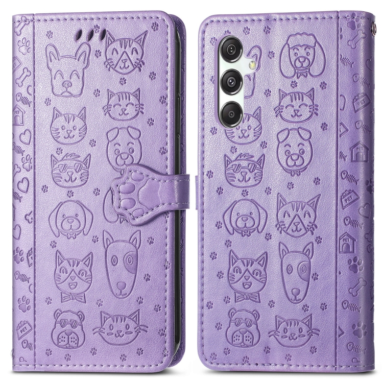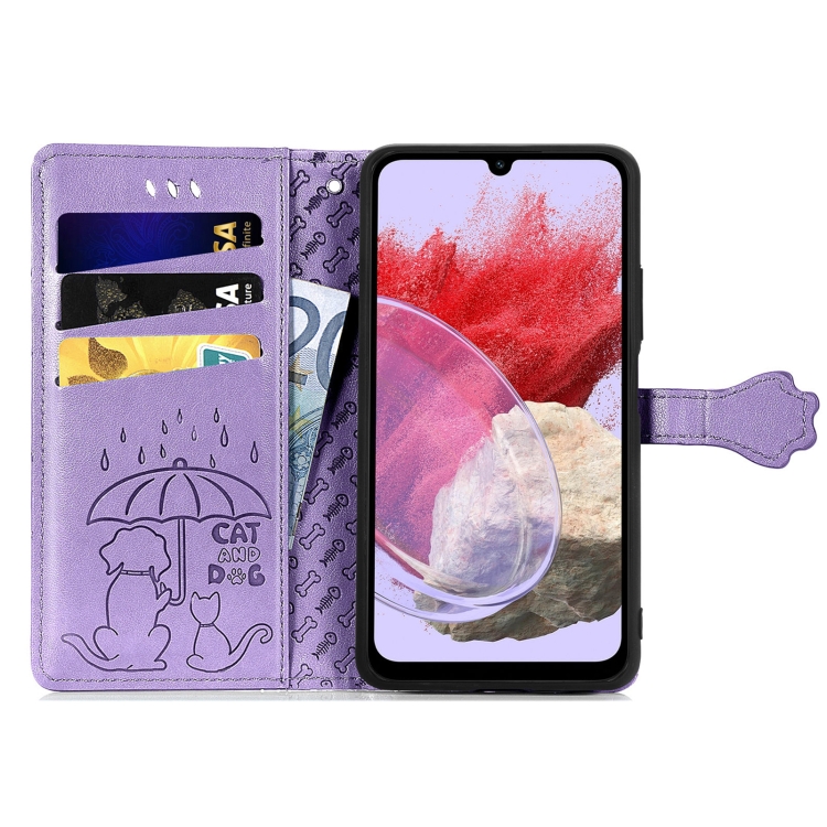 Funda para Teléfono Samsung Galaxy M34 5G Cuero Relieve Perro y Gato (Púrpura)