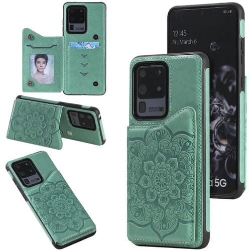 Estuche protector para Samsung Galaxy S20 Eltra con patrón de flor en relieve, soporte, ranuras para tarjetas y marco de fotos (Verde)