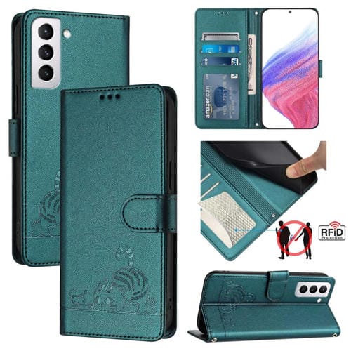 Estuche para Teléfono Samsung Galaxy S21 FE 5G Cuero Rfid Patrón En Relieve y Cordón (Verde Pavo Real)