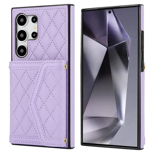 Estuche para Teléfono Samsung Galaxy S24 Ultra 5G con Bolsa para Tarjetas Textura Rómbica y Cordón Largo (Púrpura)