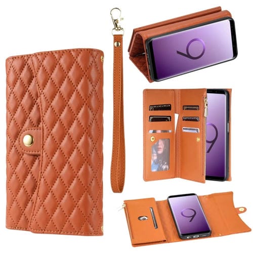 Funda para Teléfono Samsung Galaxy S9 Cuero Rómbico con Billetera MultiTarjeta con Cremallera (Marrón)