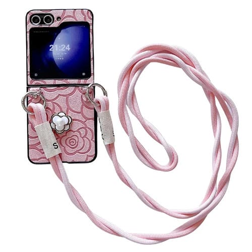 Funda Protectora Samsung Galaxy Z Flip3 5G Impression Camellia Pattern con Cordón Largo (Rosa)