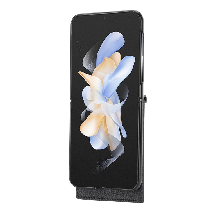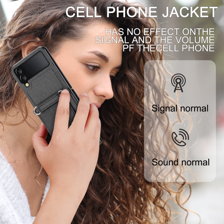 Funda para Teléfono Samsung Galaxy Z Flip4 5G con Tarjetero de Un Solo Botón Patrón Litchi y Cordón Largo (Negro)