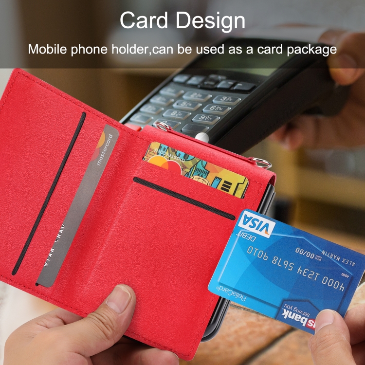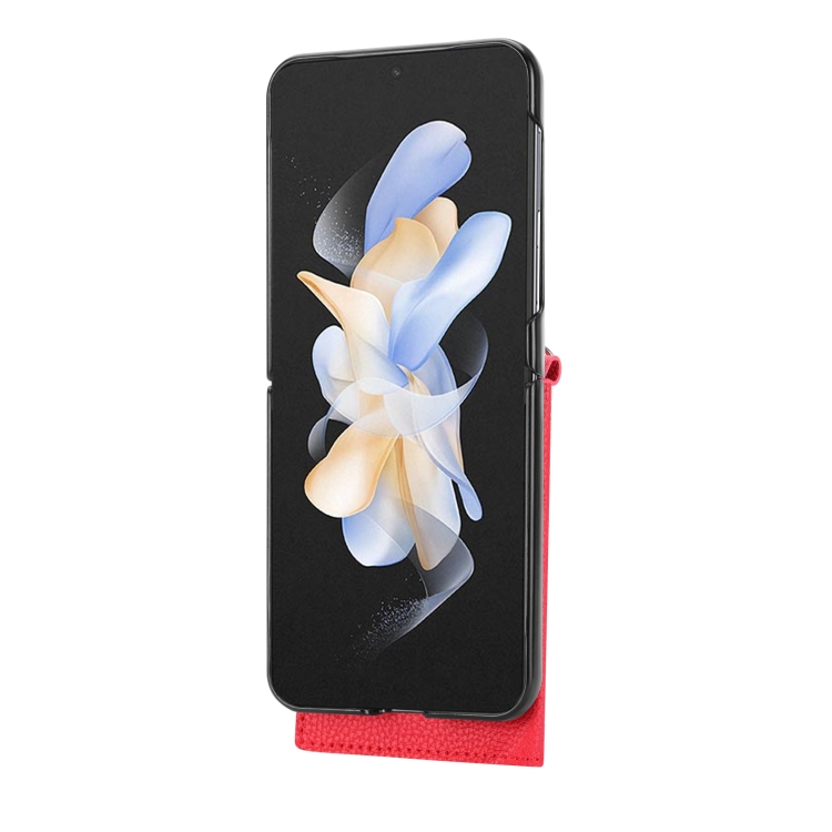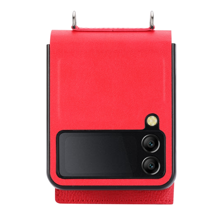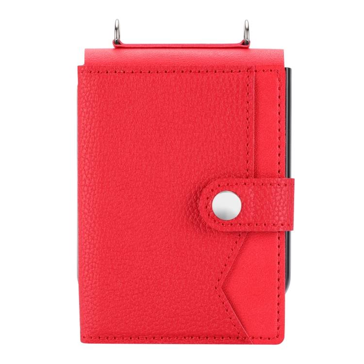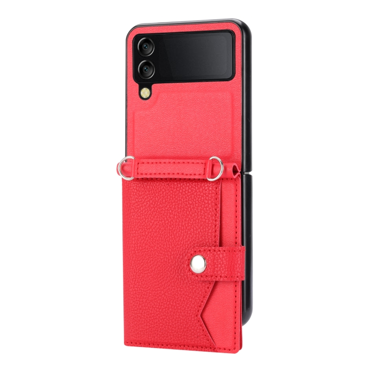 Funda para Teléfono Samsung Galaxy Z Flip4 5G con Tarjetero de Un Solo Botón Patrón Litchi y Cordón Largo (Rojo)