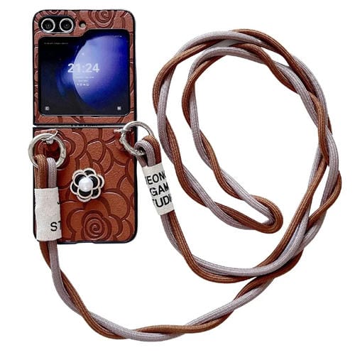 Funda Protectora Samsung Galaxy Z Flip5 5G Impression Camellia Pattern con Cordón Largo (Marrón)