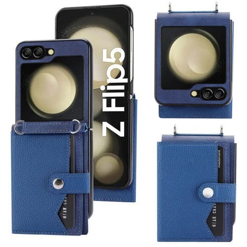 Funda para Teléfono Samsung Galaxy Z Flip5 Litchi Pattern con Tarjetero y Cordón Largo (Azul)