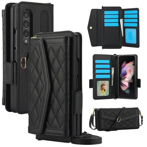 Estuche para Teléfono Samsung Galaxy Z Fold3 5G con Tarjetero Textura Rómbica Empalme con Cordón (Negro)