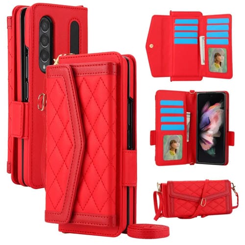 Estuche para teléfono Samsung Galaxy Z Fold3 5G con tarjetero textura rómbica y empalme con cordón (Rojo)