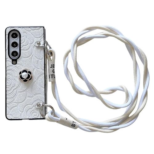 Funda Protectora Samsung Galaxy Z Fold4 5G con Patrón de Camelia y Cordón Largo (Blanco)