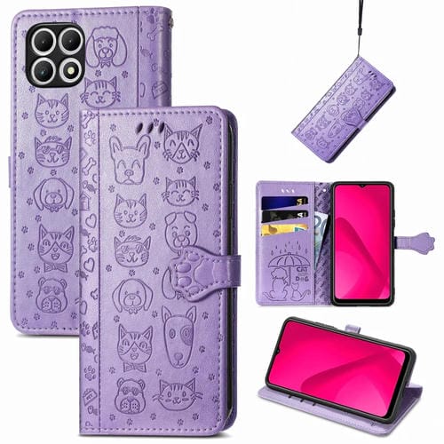 Funda de Cuero para T-Mobile T Phone 2 5G con Relieve Perros y Gatos (Púrpura)