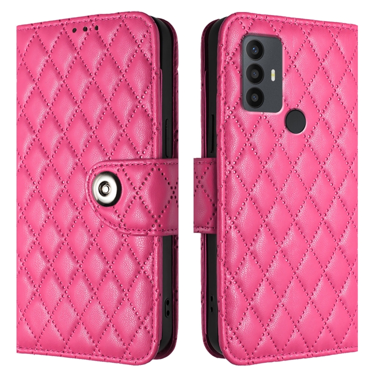 Funda para TCL 30 Se de Cuero con Tapa Textura Rómbica y Cordón (Rojo Rosa)