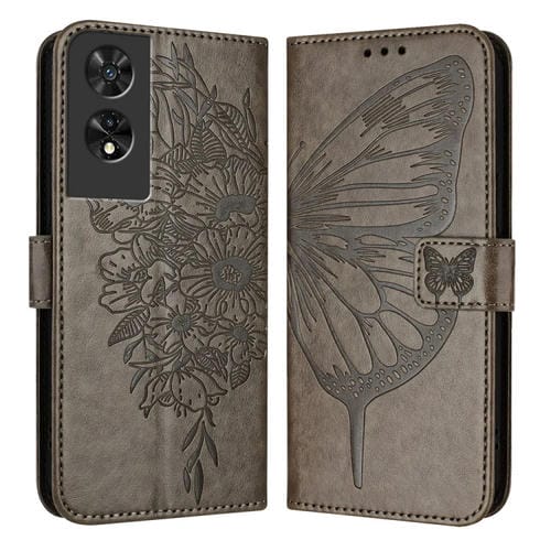 Funda de Cuero para TCL 505 con Mariposa en Relieve (Gris)